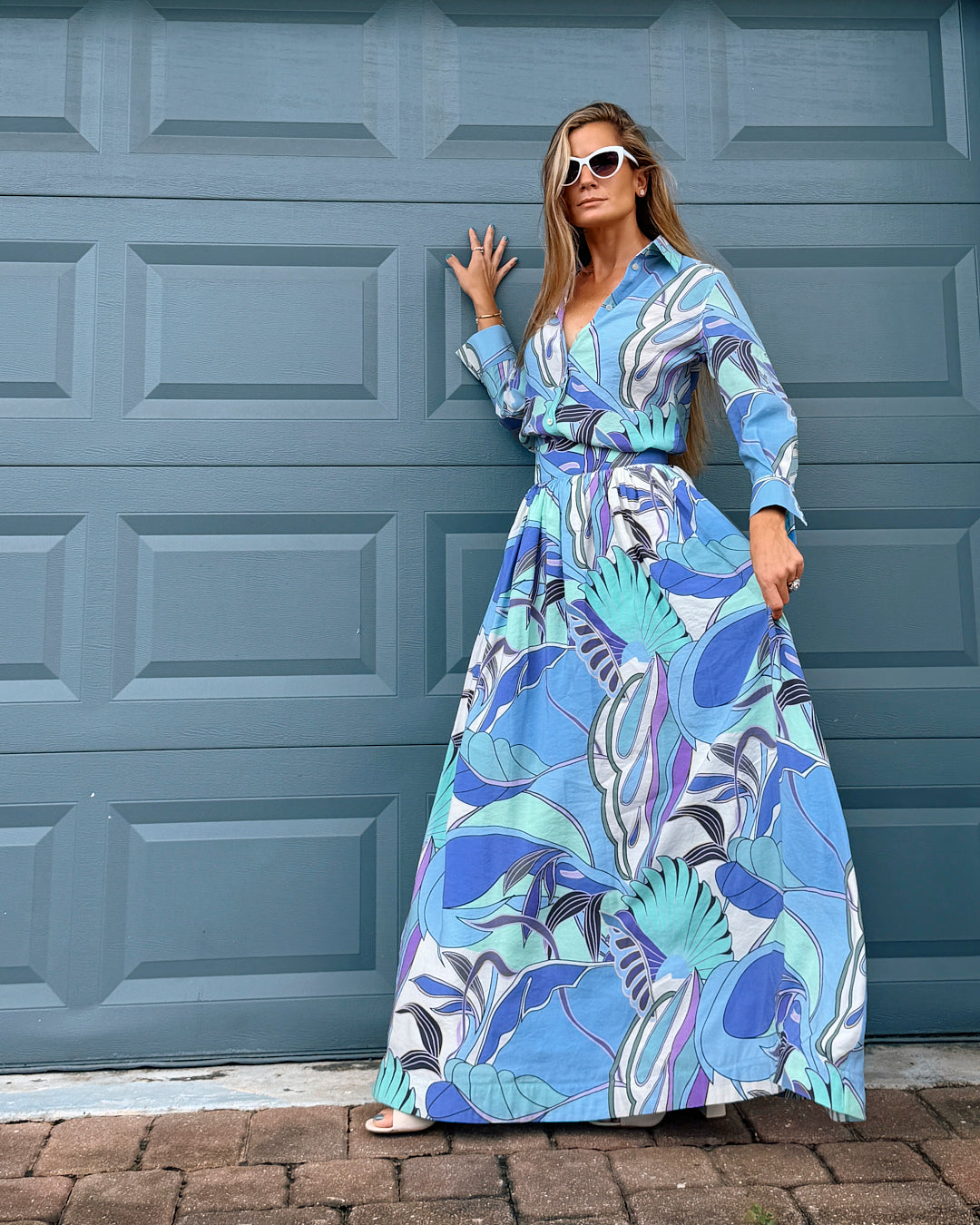 Flowy, artistic, and effortlessly chic—the Elena Dress brings a fresh take to everyday elegance. Designed with a soft button-down shirt top and a relaxed, flowing maxi skirt, this piece features a dreamy abstract print in shades of blue, aqua, and soft lavender.