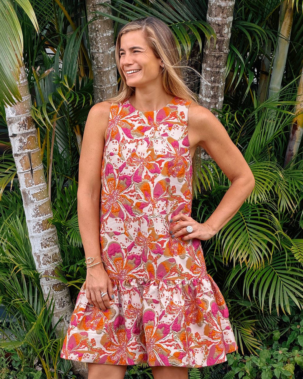 The sleeveless silhouette and drop-waist ruffle hem create a flattering and playful shape, perfect for day-to-evening dressing.