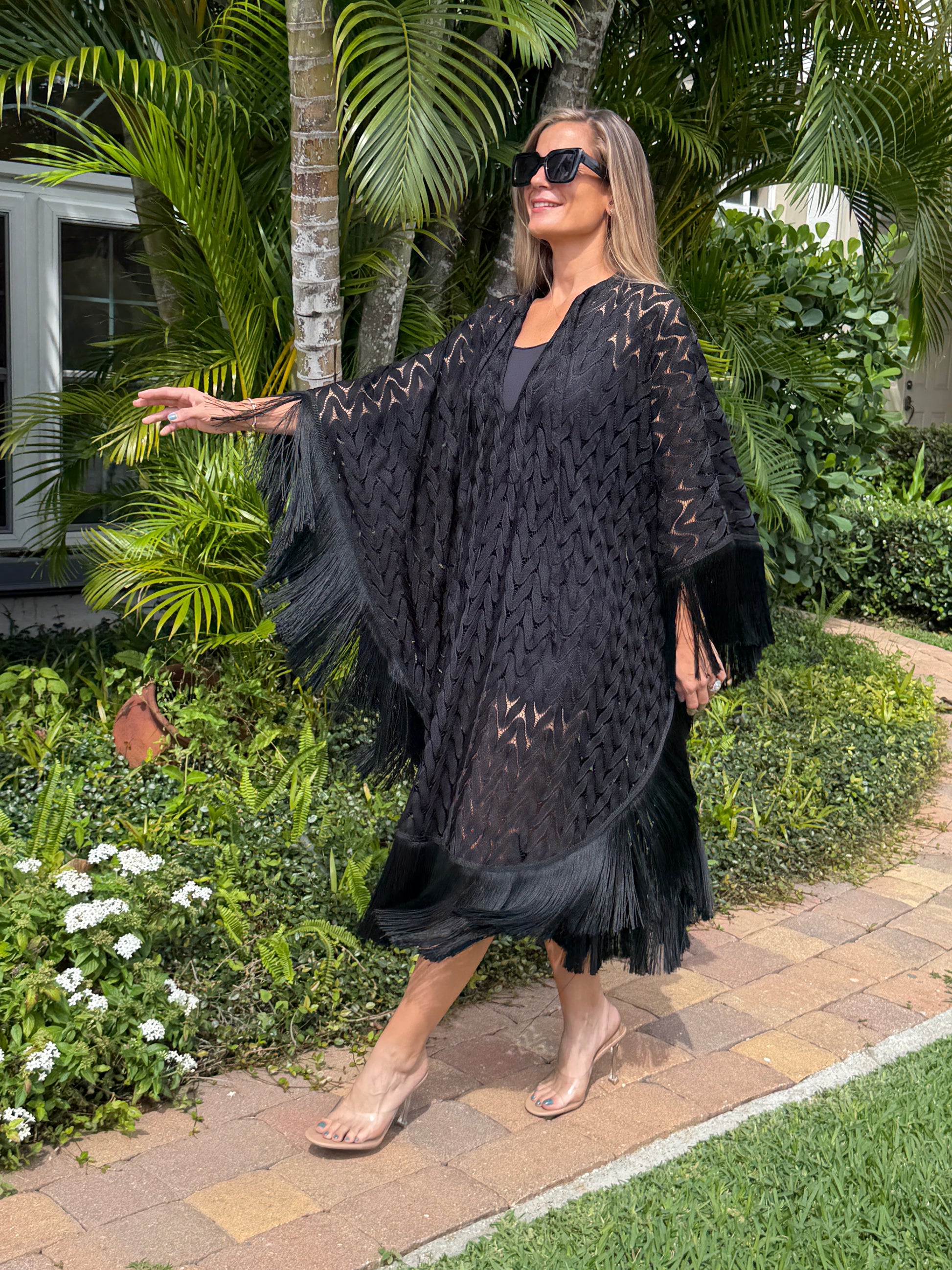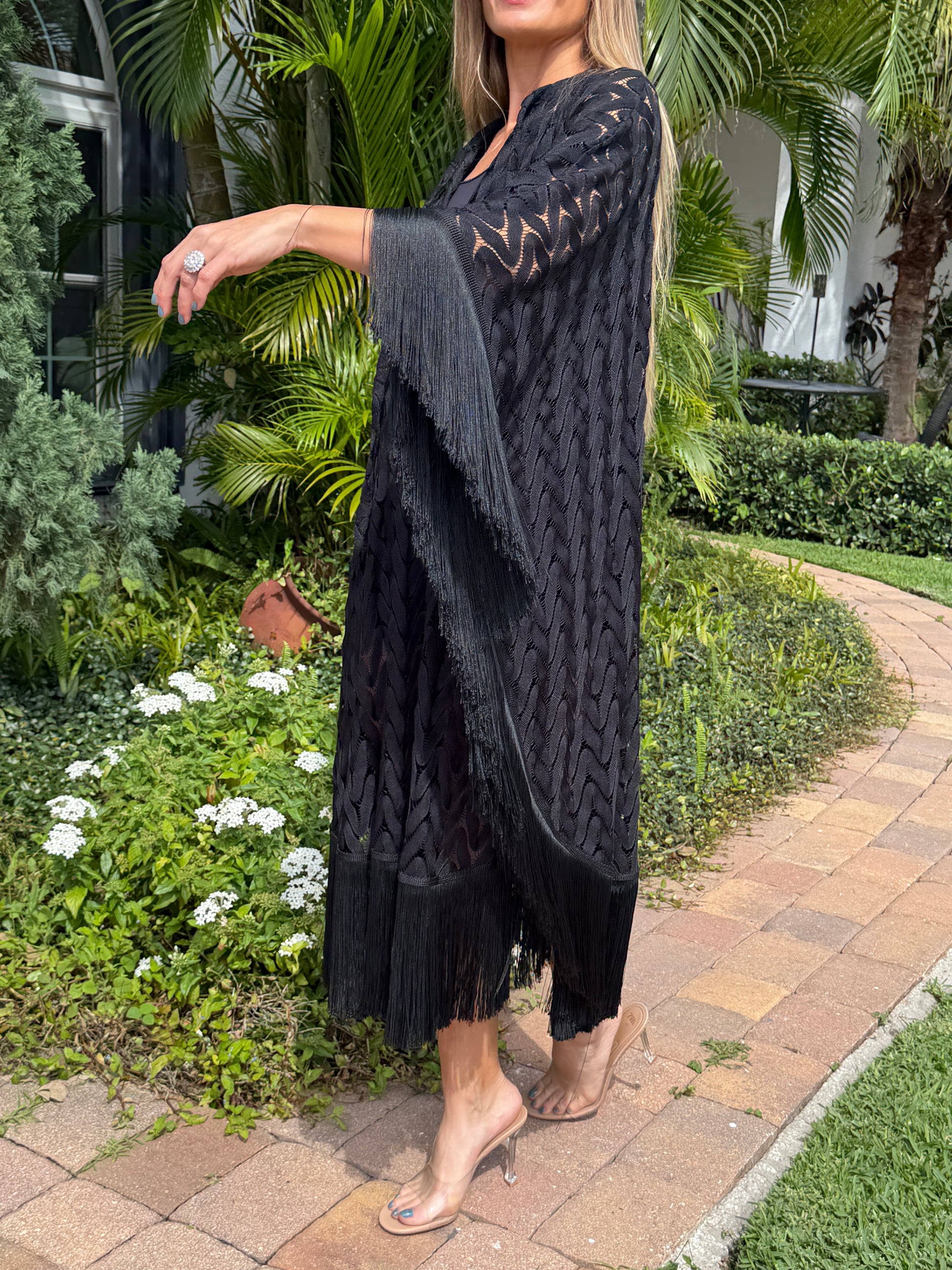 This black knit kaftan dress features a fluid silhouette enhanced by delicate fringe detailing. Light and breathable, it moves beautifully with the body.